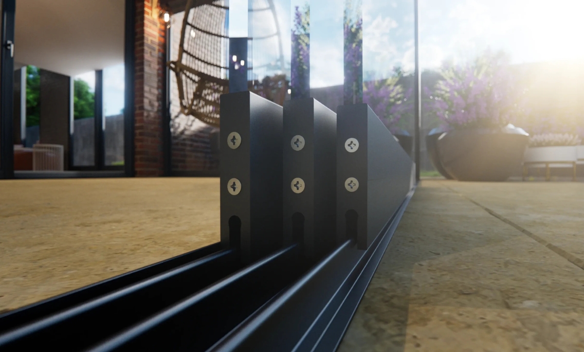 Da nur drei Schienen nötig sind, bleibt das System besonders schlank. Das ist ideal, wenn wenig Platz für die Tiefe der Schiene zur Verfügung steht, zum Beispiel bei schmaleren Überdachungen.